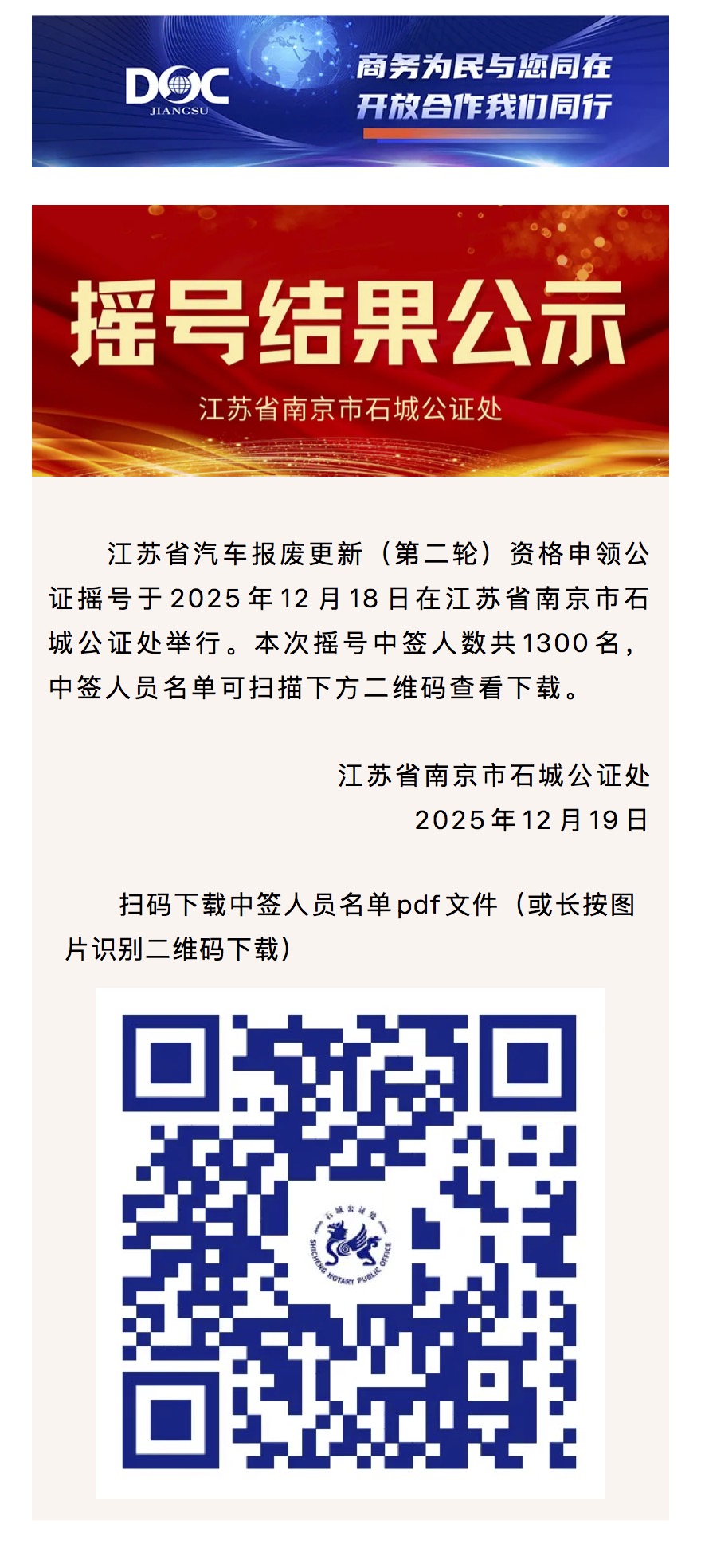江苏省汽车报废更新(第二轮)资格申领公证摇号结果公示